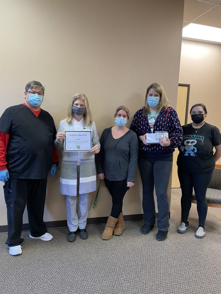 A photo of Felicia Campbell (second from right) with Stephanie Leonard (second from left) and the Pima Medical Institute students who are now employees of Saliba’s.