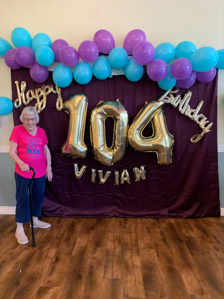 Lora Reynolds, a nurse account manager at Saliba’s Pharmacy, attended the 104th birthday celebration for one of our community’s residents, Vivian Brikferd, on August 31. The event occurred at Broadway Mesa Village with Fox News and other media present for this milestone celebration. Vivian is an extremely independent, active senior who is ‘sharp as a tack,’ according to Lora. Her spryness is attributed to the daily walks she takes to visit her many friends at the community. Vivian provided each guest with a candy bar personalized with her photo, a thank you for coming to her party and the Lord’s Prayer affixed to the back.