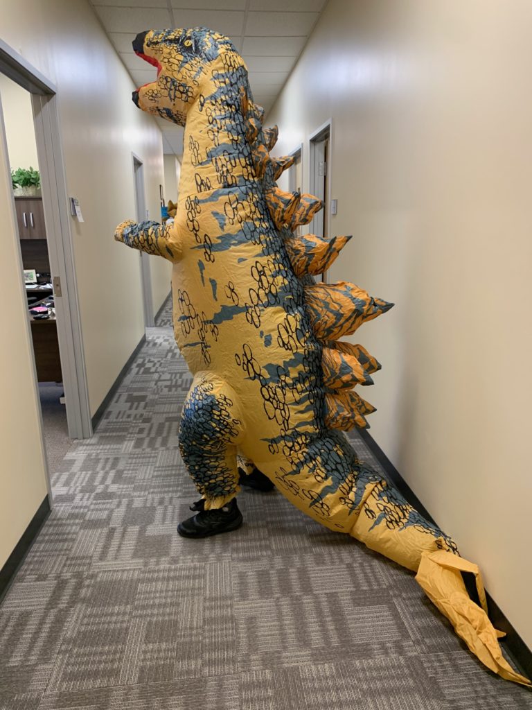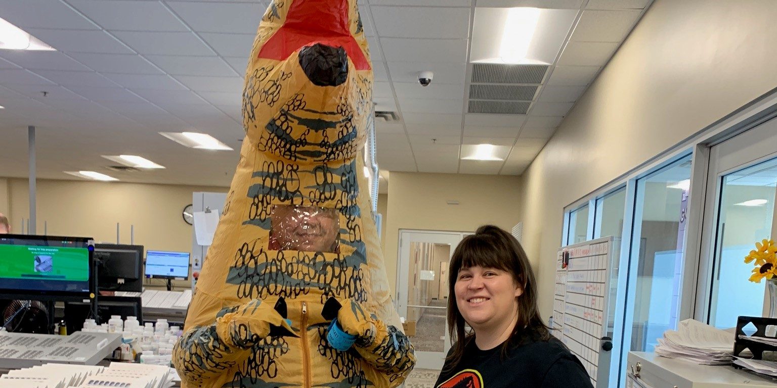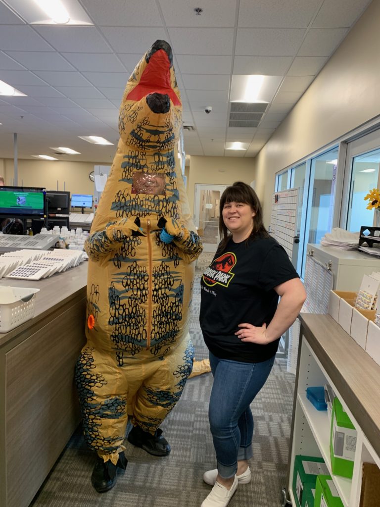Empowering our managers to plan employee events allows them to foster engagement and fun at work while showing appreciation for our wonderful team members! Our May “Employee Engagement Experience” is a movie-themed month. Already this month, we’ve had a movie playing in our breakroom every Friday with candy, prizes and scavenger hunts. Later this month, we will even have a popcorn truck event. The photos depicted below are of our business intelligence analyst and our fulfillment supervisor contributing to the mood of Jurassic Park week.