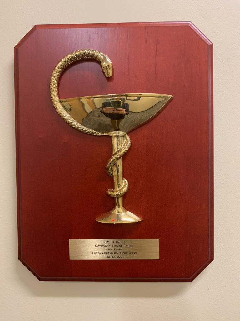 John Saliba, president of Saliba’s Extended Care Pharmacy, was recently honored with the 2022 Bowl of Hygeia Award by the Arizona Pharmacy Association during their annual convention on June 18. This prestigious award is the highest level of recognition provided to an Arizona pharmacist and recognizes John’s considerable service contributions in the state of Arizona.