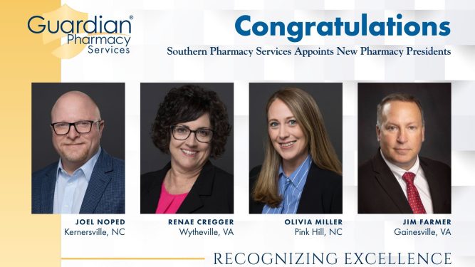 Southern Pharmacy Services, a long-term care (LTC) pharmacy provider and member of Guardian Pharmacy Services, has appointed four leaders to newly created president roles at each of its regional locations. Joel Noped, Renae Cregger, Olivia Miller, and Jim Farmer will now lead pharmacy operations in Kernersville, N.C.; Wytheville, Va.; Pink Hill, N.C.; and Gainesville, Va., respectively. Together, these pharmacies provide critical pharmacy services to residents in assisted living, skilled nursing and behavioral health communities, as well as individuals with intellectual and developmental disabilities across North Carolina, West Virginia, Virginia, and Maryland.
